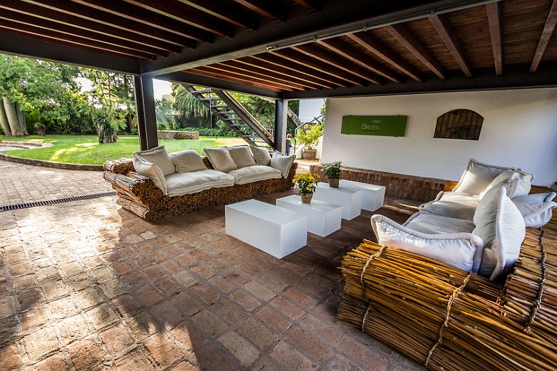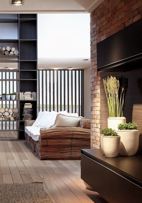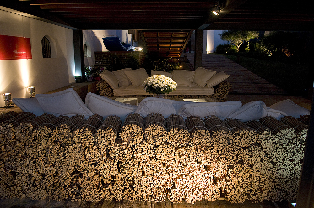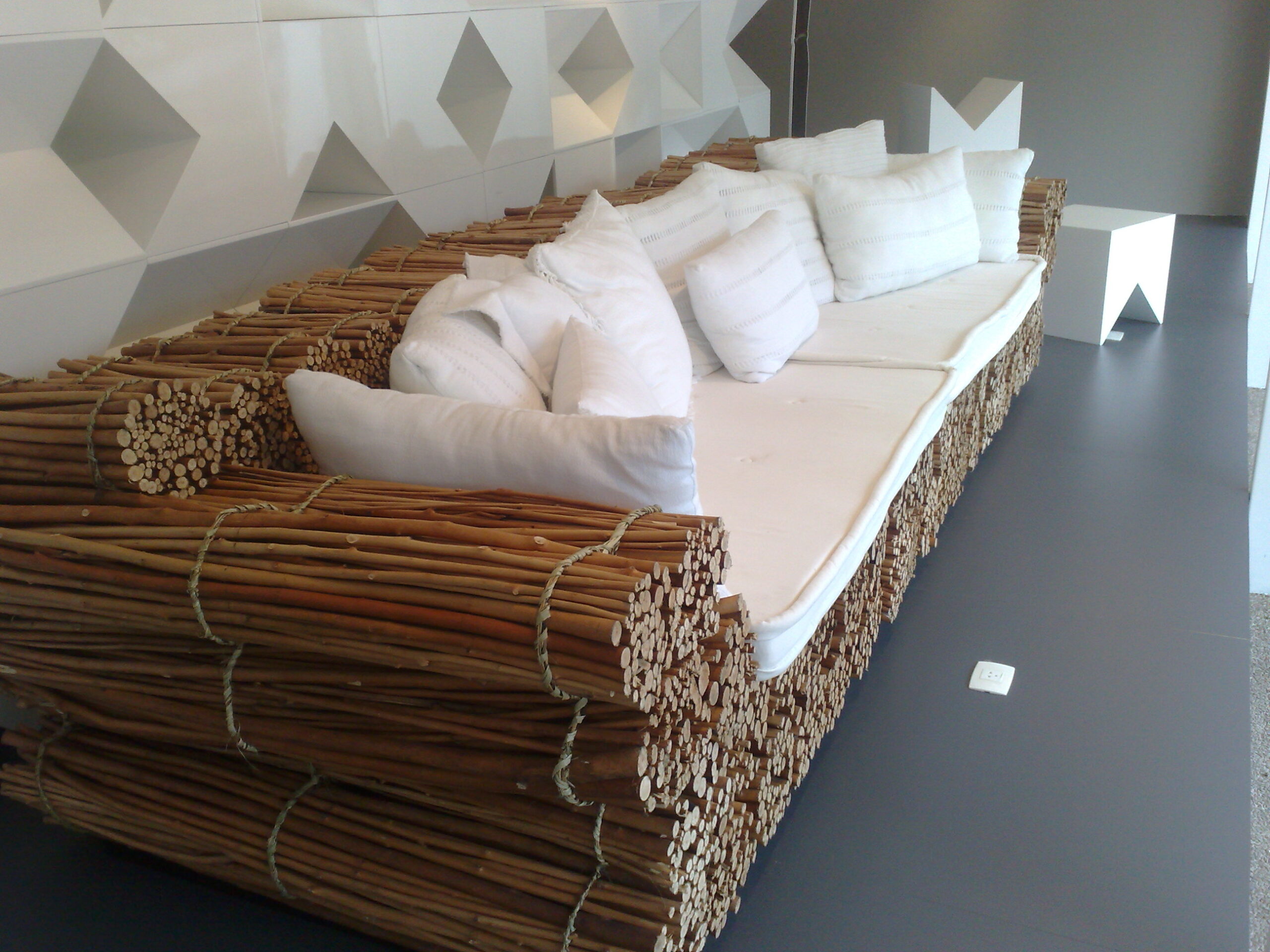 Maços de vime natural amarrados com imbira e arame, tomam a forma de um sofá único, de personalidade marcante. Almofadas revestidas em algodão natural cru complementam o estilo da peça.