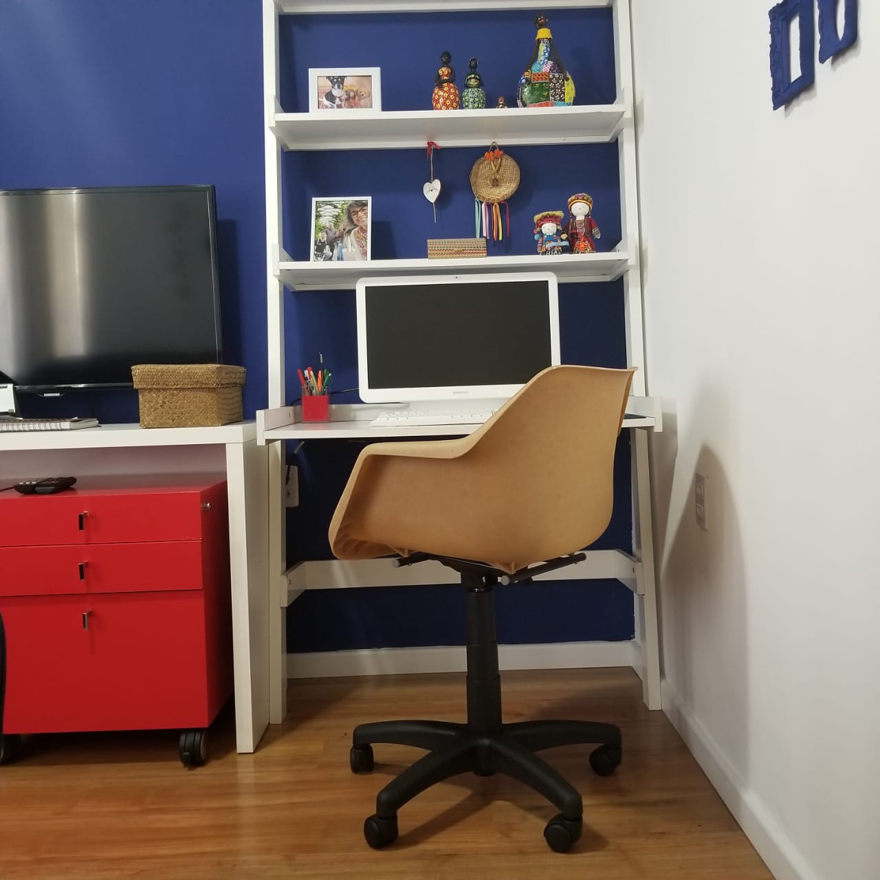 Cadeira giratória. Base tubular com concha injetada em polipropileno, base giratória em nylon, regulagem de altura e rodízios.