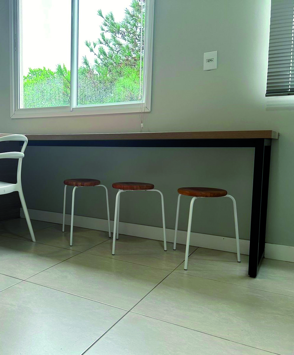 Banco Cumbuca baixo, empilhável. Base metálica e assento de madeira de eucalipto.