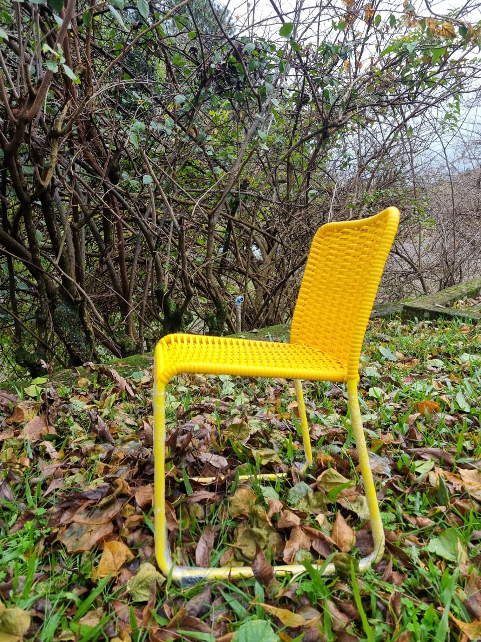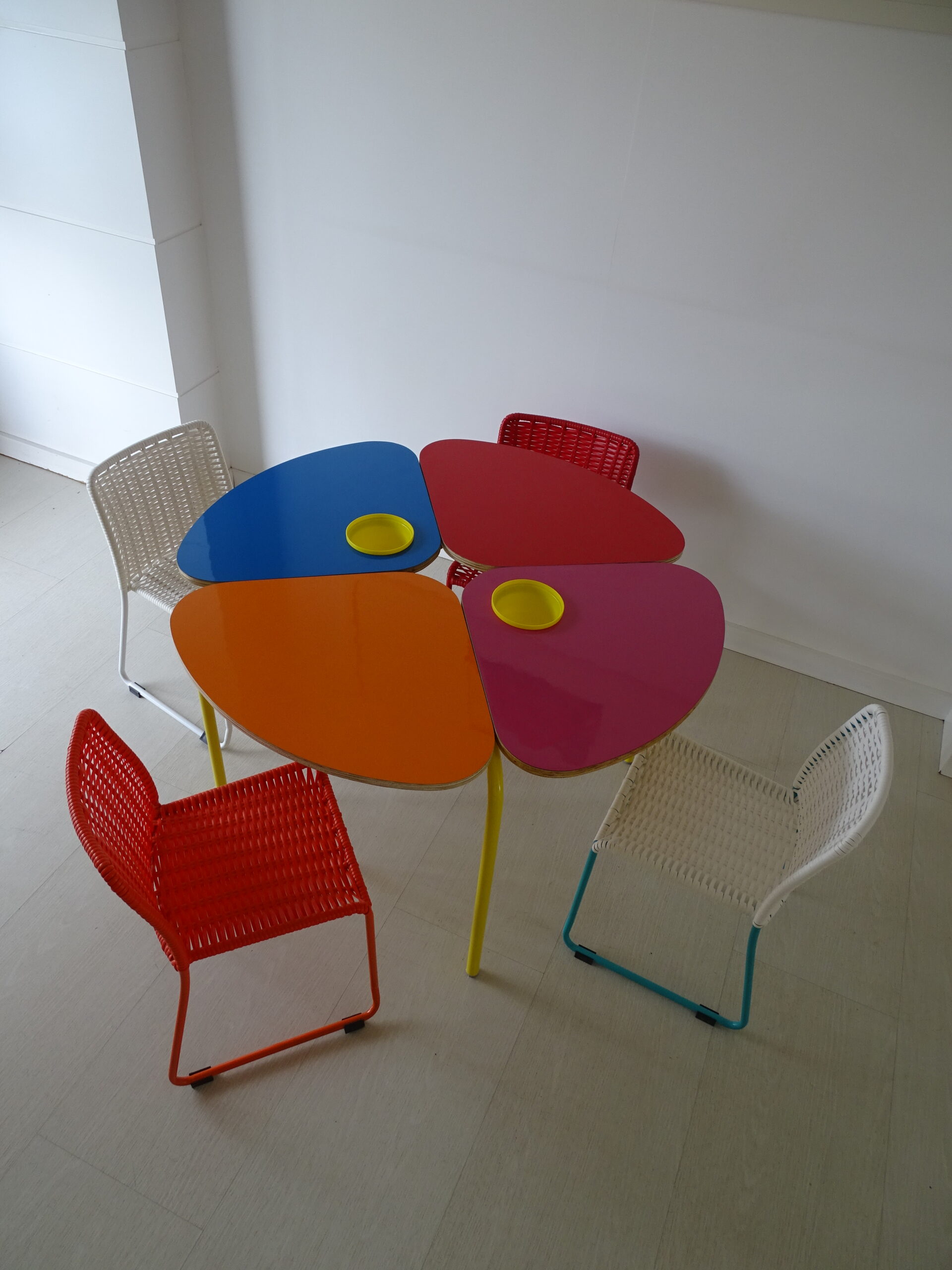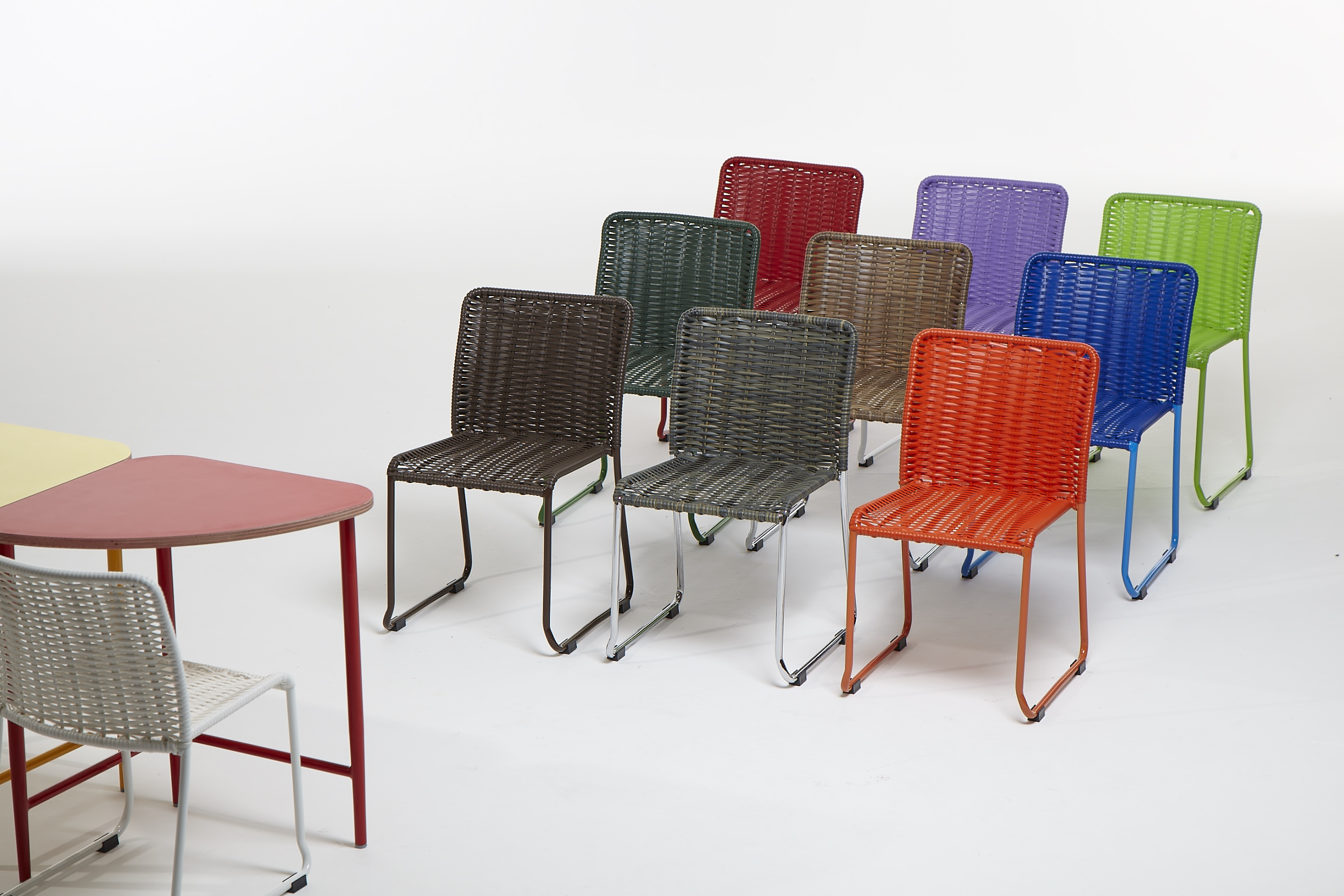 Cadeira infantil empilhável. Armação em metal e trama em fio sintético.