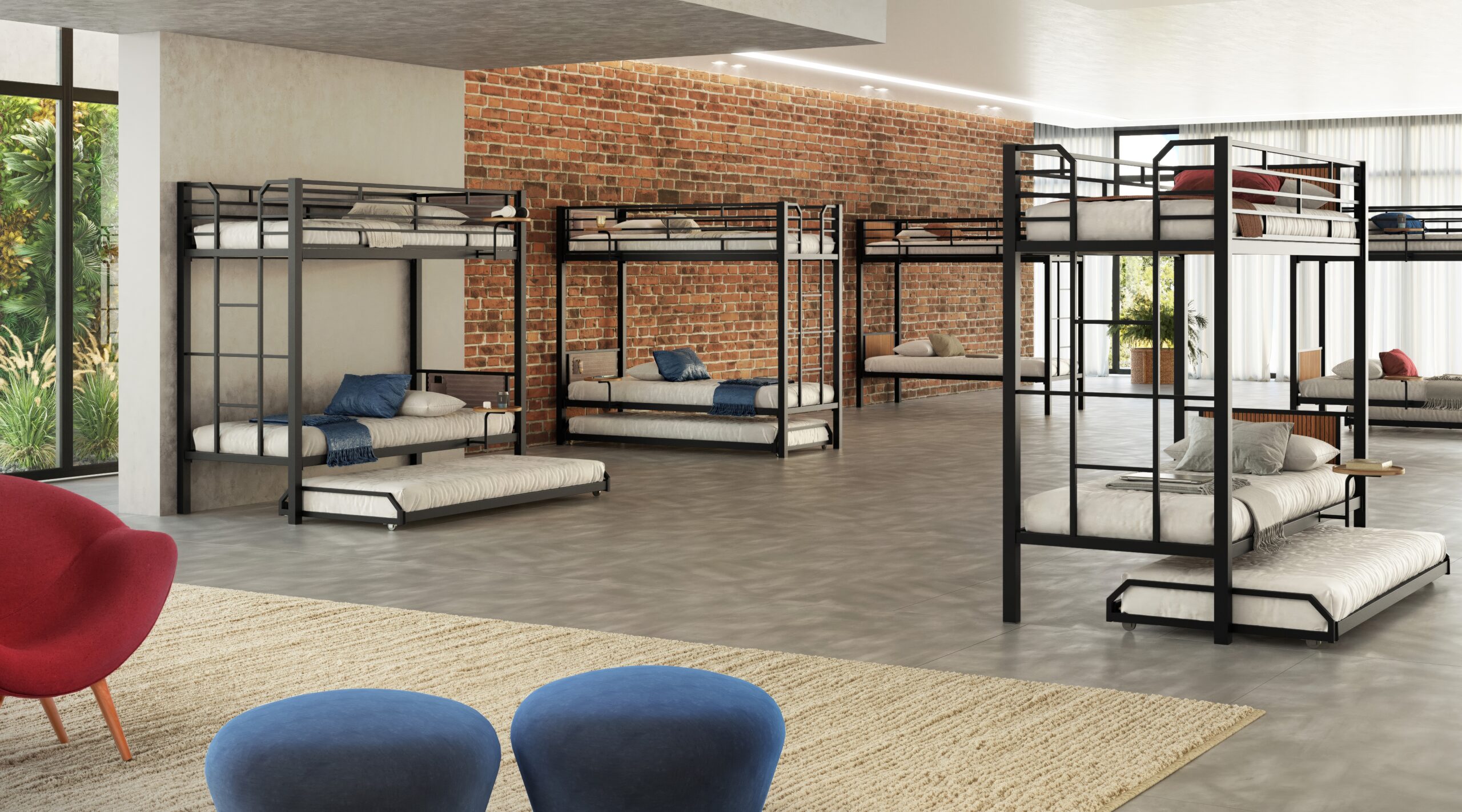 Tubos inteiros unindo cabeceira e peseira das duas camas proporcionam estabilidade e segurança.