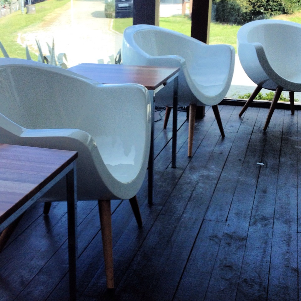 A poltrona Abraço de Fibra tem acabamento liso e pintura automotiva. A combinação da fibra em diferentes cores e da madeira realça os ambientes com beleza e praticidade.