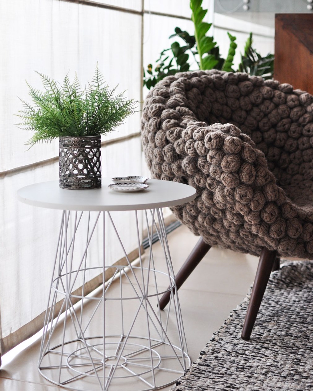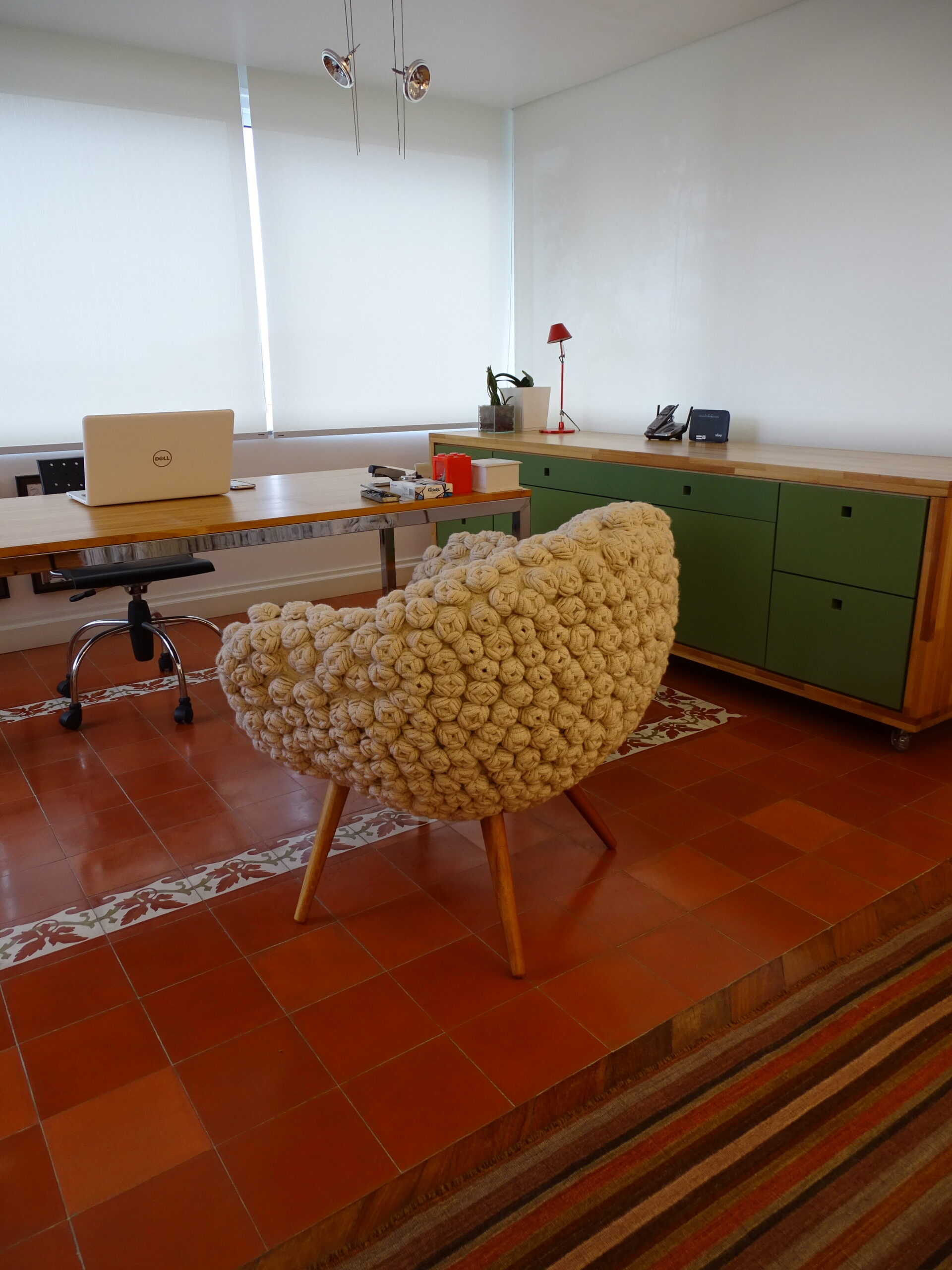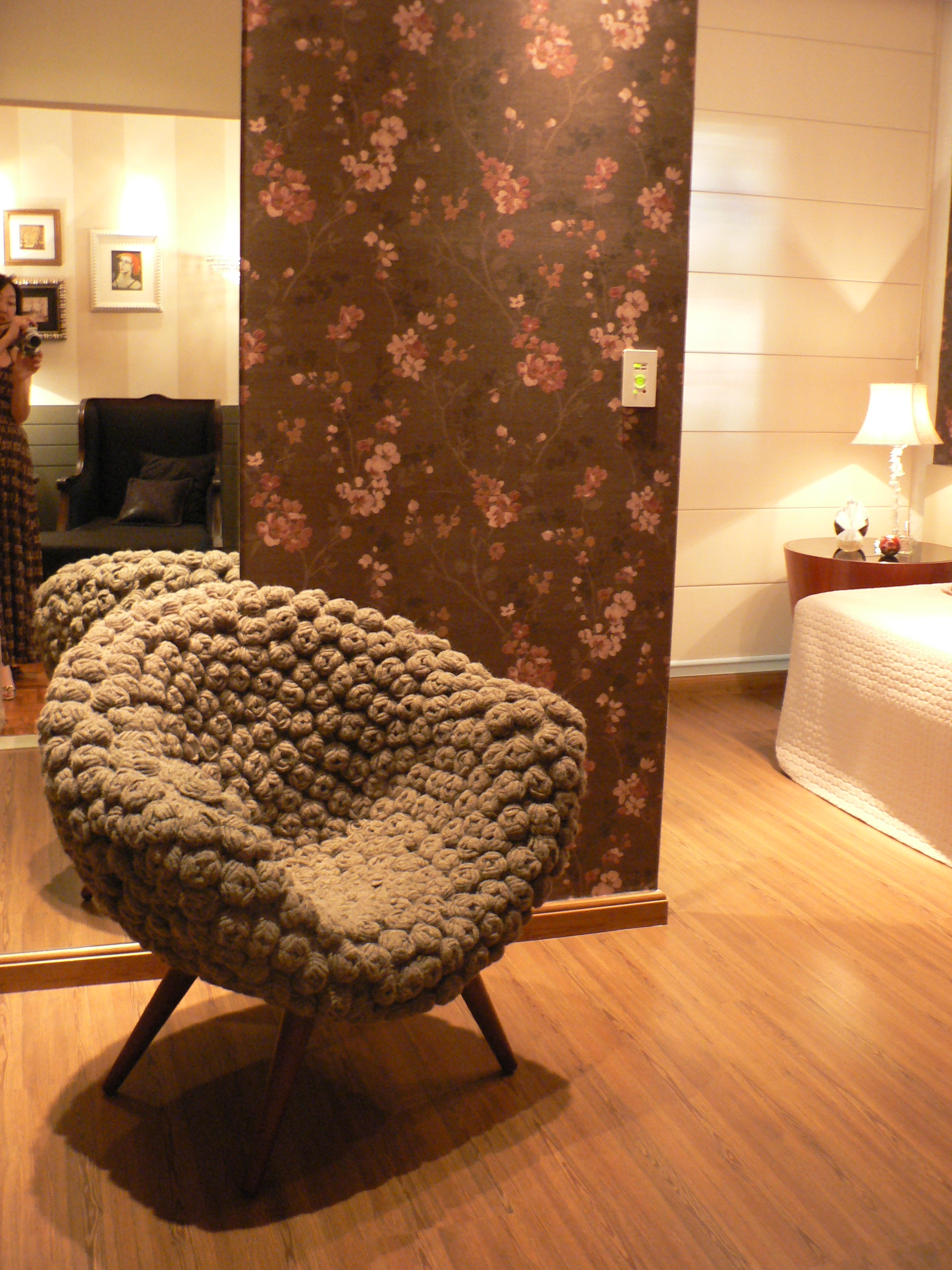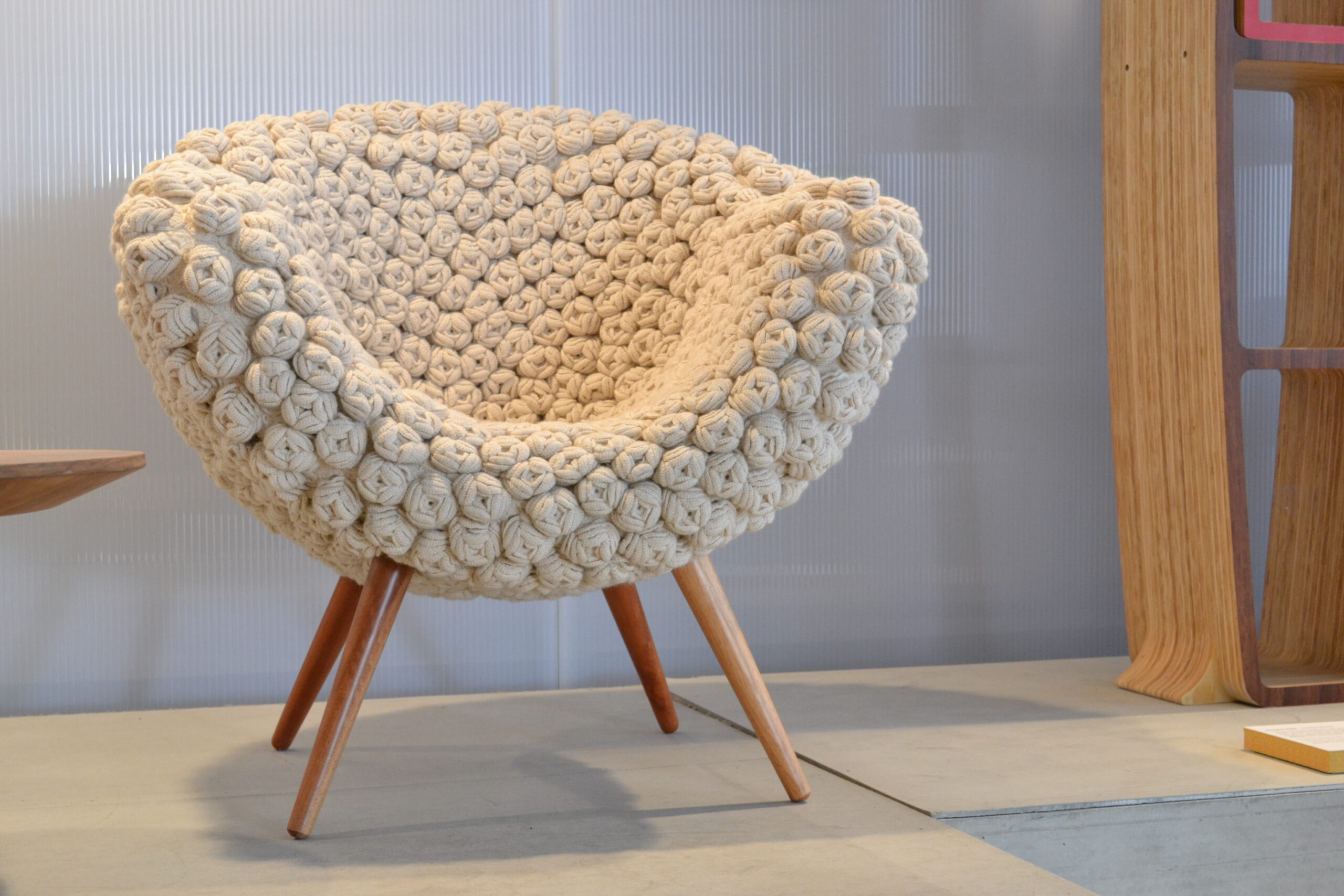 A poltrona Abraço de Flor alia delicadeza estética ao elemento funcional. O design artesanal, trabalhado com 800 flores de crochê em lã pura, sem tingimento, forma peças com aconchego, conforto térmico, elegância e história.